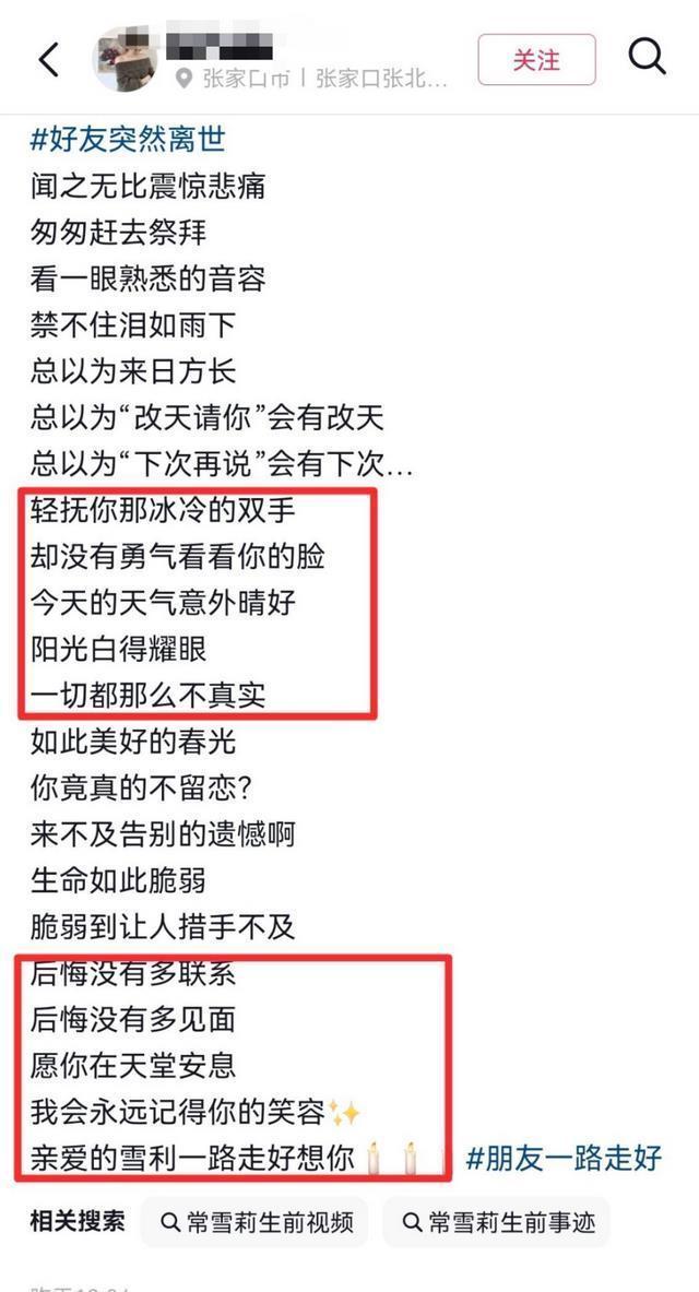 在那位发文网友的评论区里,有网友留言回复:“常雪莉生前性情极为和善。”由此可见,她应是个温暖纯善之人。 亦有网友在评论区表达了自己的震惊:“原来被‘老头乐’撞倒的人是她啊?”从这些留言中不难看出,当地群众对于常雪莉的离世深感错愕与意外。